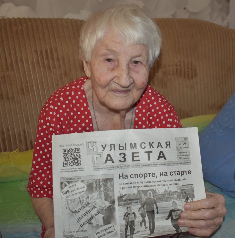Это одна из старейших наших читательниц. В свои 95 лет она читает «Чулымскую газету» от корки до корки и всегда с нетерпением ждёт нового выпуска. Уже сейчас просит сына оформить подписку на следующий год.