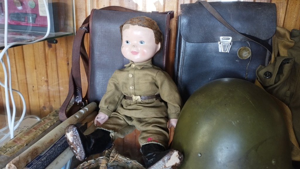 В библиотечном музее есть его гипсовый литературный двойник — «взрослый» персонаж, к тому же — курящий. Новый экспонат совсем ребенок. Его так и хочется взять на ручки и держать, наглаживая скромную шевелюру. Тем не менее, с олицетворением персонажа кукла справляется отлично: есть гимнастерка с пуговками, на пуговках — звезды, есть галифе, даже хромовые сапоги имеются. А когда-то на голове была пилотка, а в руках гармошка, но эти атрибуты утрачены.
