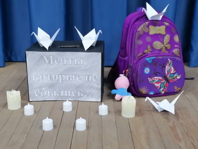 Школьники создали «дерево памяти», на котором разместили белых журавлей, и зажгли свечи в память о тех, кто стал жертвой тех страшных событий.