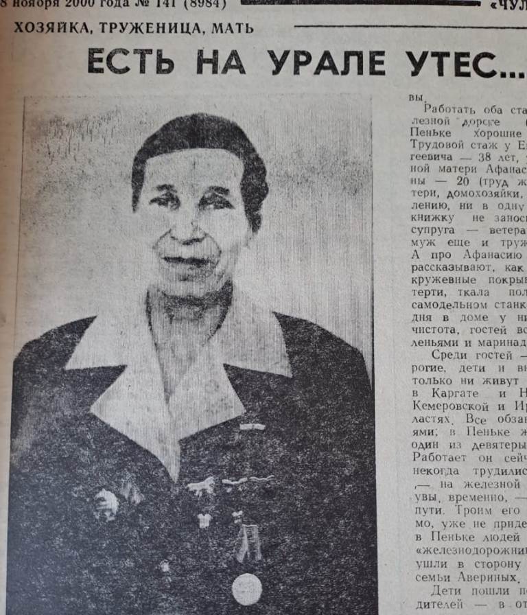 «Давно это было 1953 год. Пермская область, уральская станция Утёс, где они встретились, влюбились друг в друга, поженились в 54-ом и прожили до 66-го, успев не удвоить-утроить, а в пять раз увеличить семью из двух человек: к моменту переезда в Пенёк, где жил брат Афанасии, в семье было уже восемь детей. И уже на чулымской земле родилась девятая дочка. Вот поэтому у Афанасии Павловны Авериной три ордена Материнской славы.