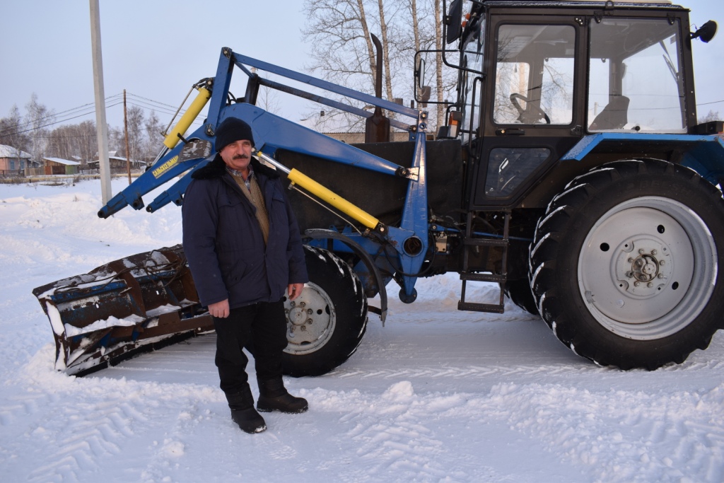 Опытный тракторист, он же водитель администрации, Олег Веселов не ждёт указаний сверху, он и сам знает, что и как нужно расчистить. После снегопада по каждой улице надо проехать четыре раза, причём не только на центральной усадьбе, но и в посёлках Каяк, где осталось восемь жителей, и Преображенка, где всего один житель. Трактор, как говорит Олег Иванович, надежный и универсальный. Летом на нём косят, обрабатывают минерализованную полосу. С помощью ковша-погрузчика подсыпают шлаком и щебёнкой дороги. Прошлым летом, говорят, косьбы было много, деревня зарастала травой. Всё потому, что с улиц убрали бродячий скот. Оградили территорию электропастухом, оставив «ворота» для прогона скота. Так что теперь бурёнки пасутся в полях. Ну а траву и скосить можно для порядка.